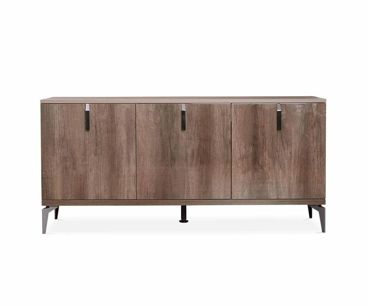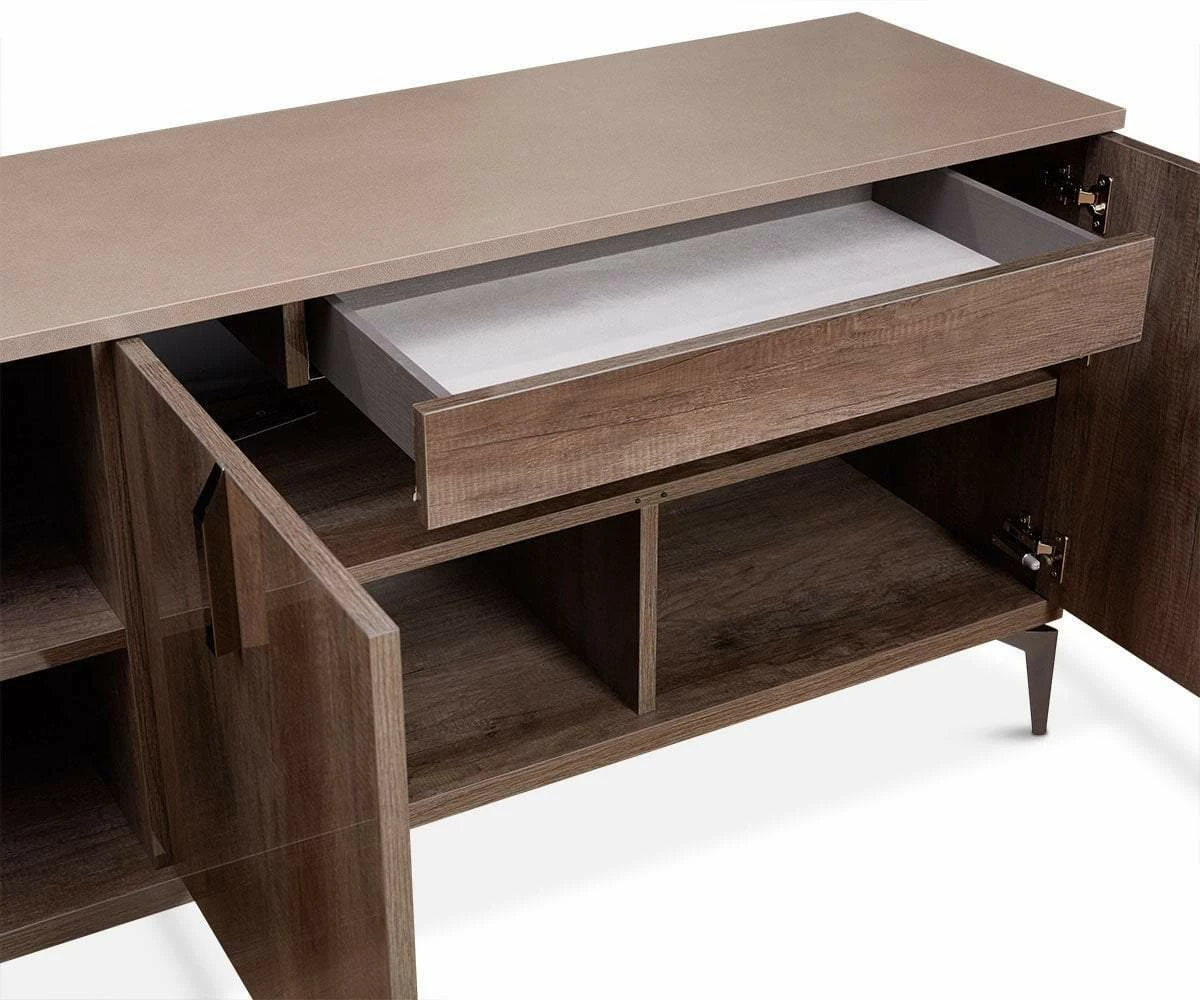 Made in Italy, the Akana Sideboard brings a wealth of storage to your dining room. A sense of natural warmth comes from the striking wood grain pattern enhanced by the high gloss finish and intriguing metal accents. Three doors open to reveal five spacious compartments and a single drawer. Organize your table decor, glassware, serving dishes and more in a stylish statement piece for your dining area.