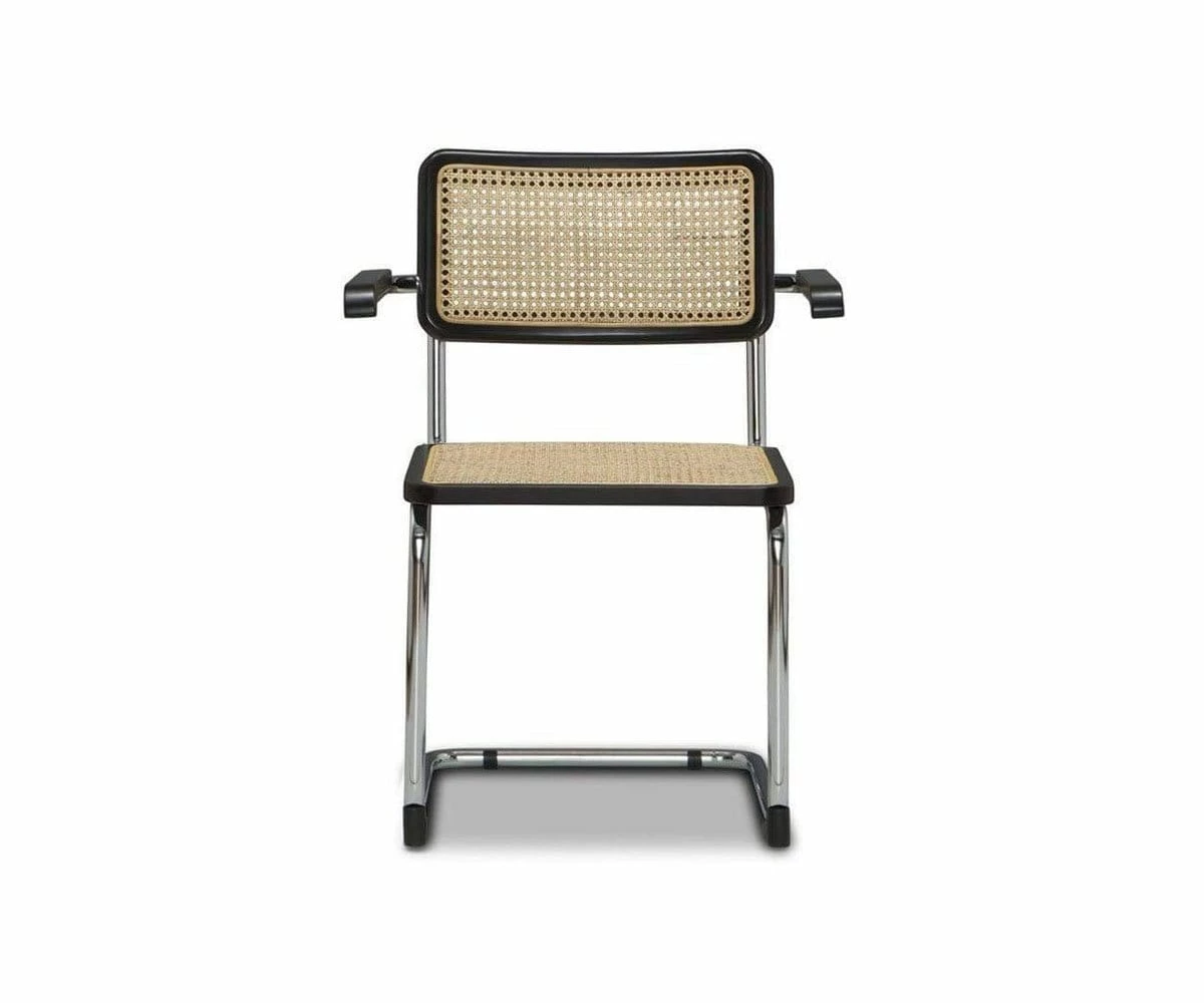 With an unmistakable mid-century look, the Bendt Armchair masterfully combines elements to create an appealing addition to your dining room. The distinctive design features a cane seat and backrest bordered in solid European beech wood which are secured to the cantilevered metal frame finished in polished chrome. Armrests made of the same materials wrap around to allow for a comfortable resting position making mealtime, quality time. *Includes removable glides and bumpers to prevent surface scratching and chair tipping.