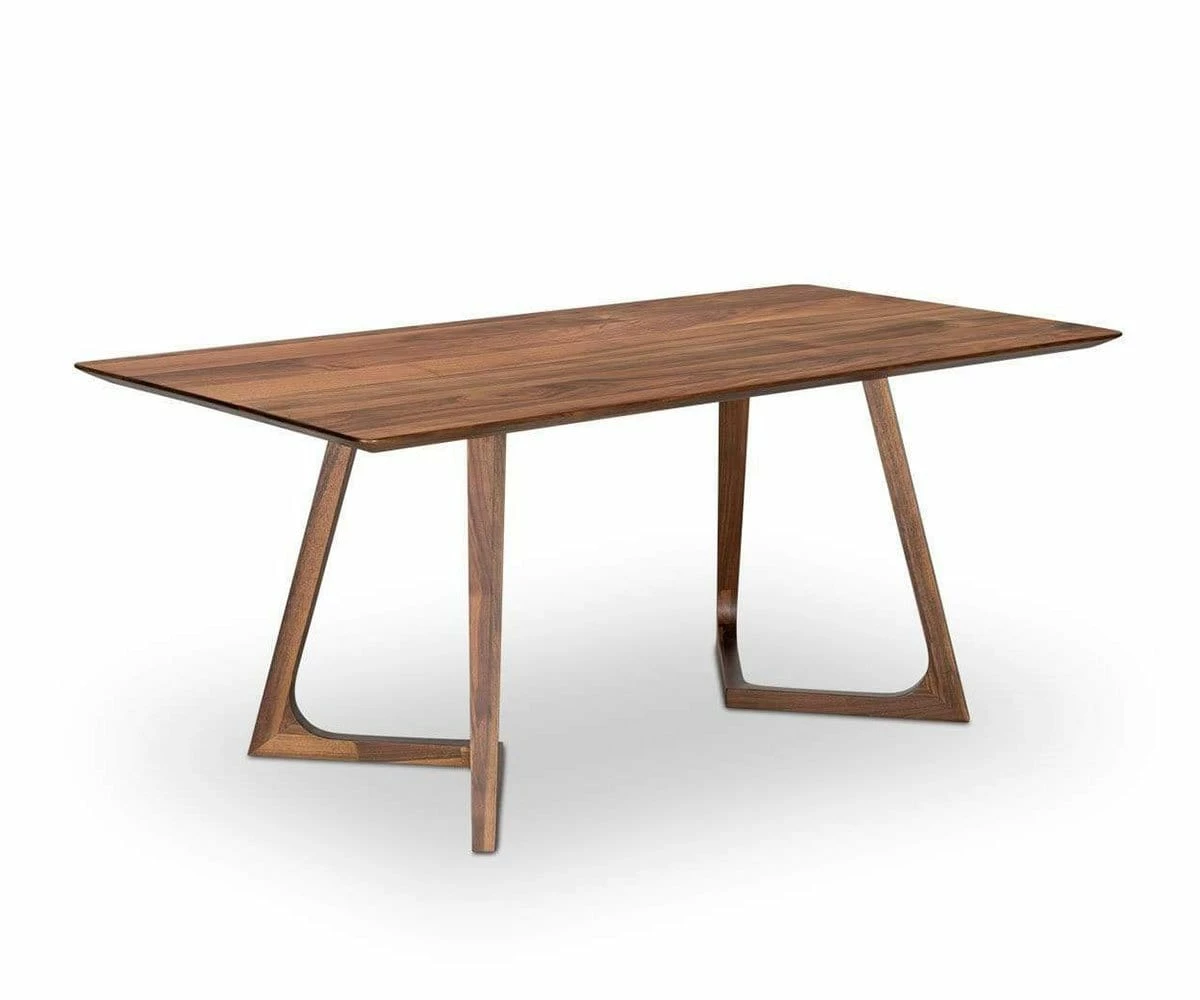 Welcome a mid-century modern touchstone to your dining space. The Cress Rectangle Dining Table features a rich, warm walnut finish, highlighting the beveled edges of the tabletop that flow elegantly to the angled legs. This piece seats six comfortably, so cozy gatherings are encouraged.