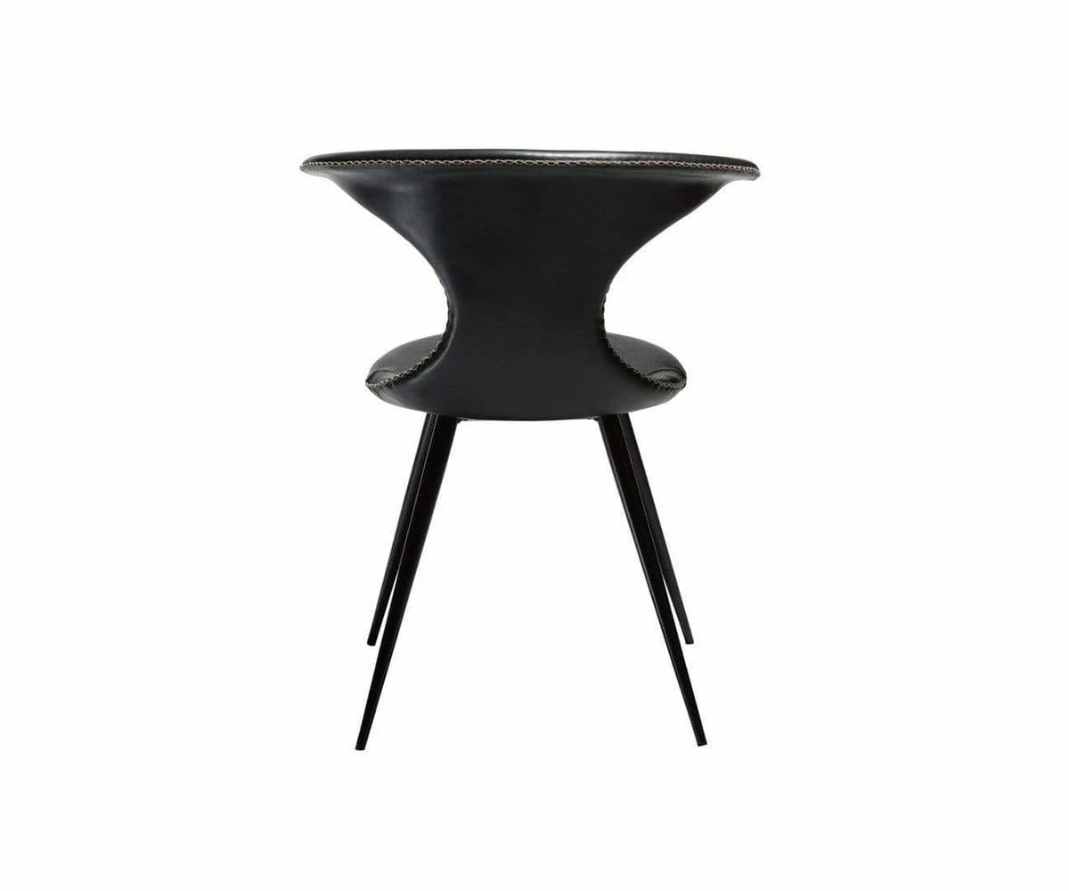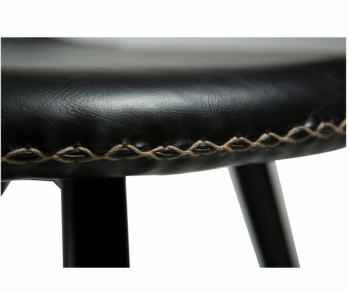 The Drake Chair is the perfect rustic industrial accent piece for your dining area. A round seat topped with uniquely curving arms echoes the classic western shape of a bullhorn. Upholstered in smooth faux leather, this chair is accented with contrasting stitching that speaks to rustic and modern Danish influences. A sturdy industrial frame features a matte black powder-coated finish, and legs that taper to subtly exaggerated points.