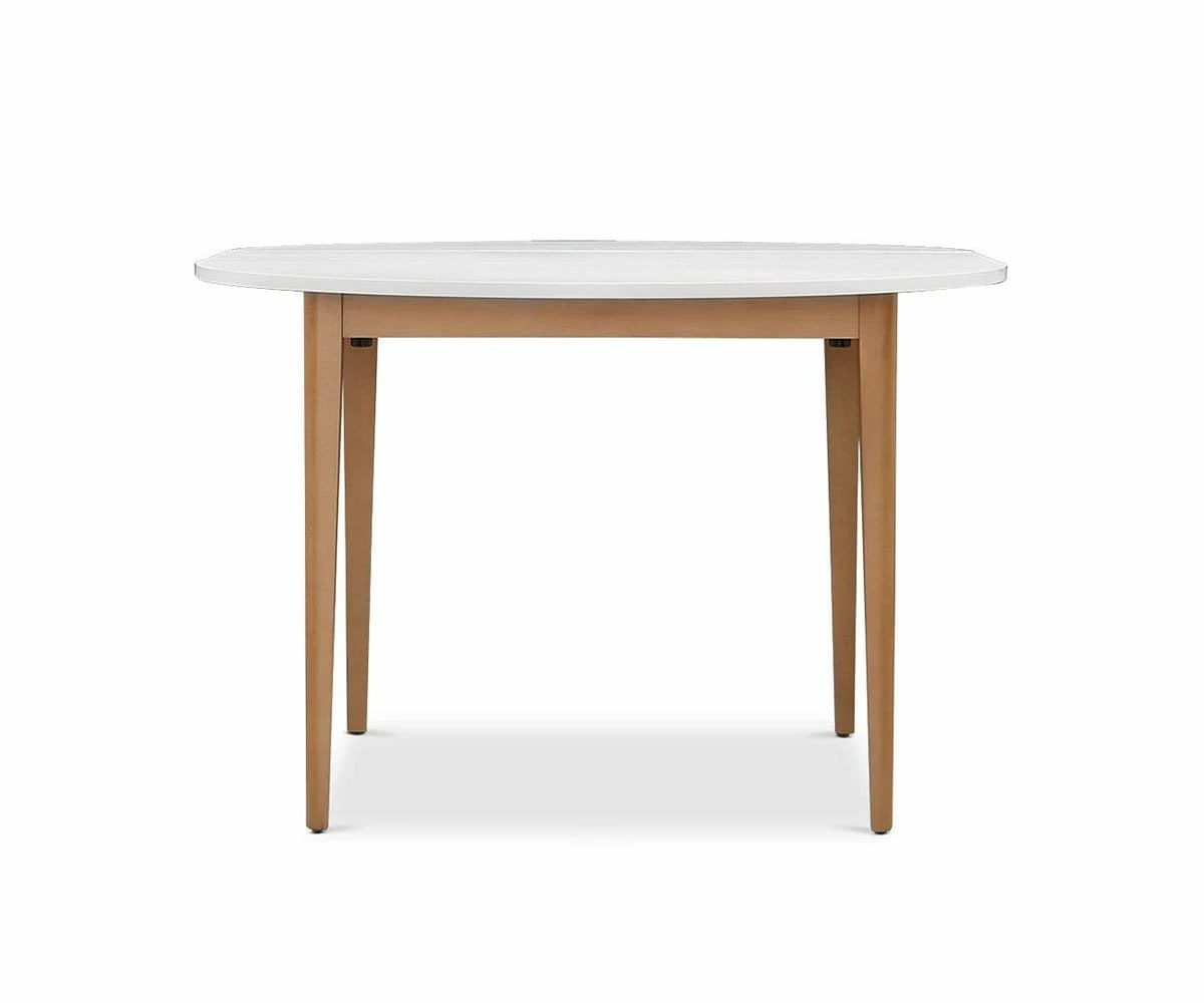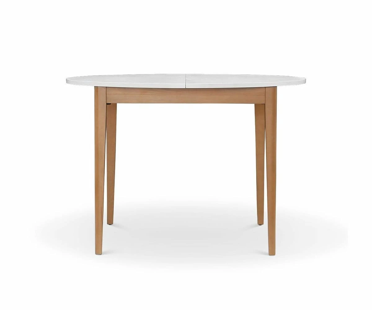 Choose the Eptri Round Extension Dining Table for smaller spaces. Tapered legs and a slim apron support the contrasting white table top for a two-tone look that is distinctly Scandinavian. Included extension leaves ensure plenty of space for surprise guests.