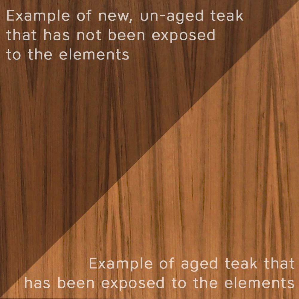This product is made with natural teak. Because it is not stained, the material enriches in appearance over time. The natural characteristics ensure every piece is unique.