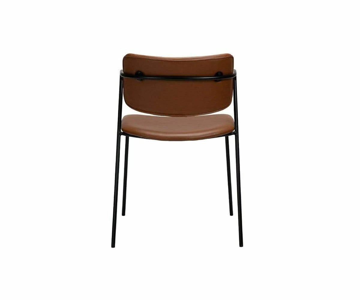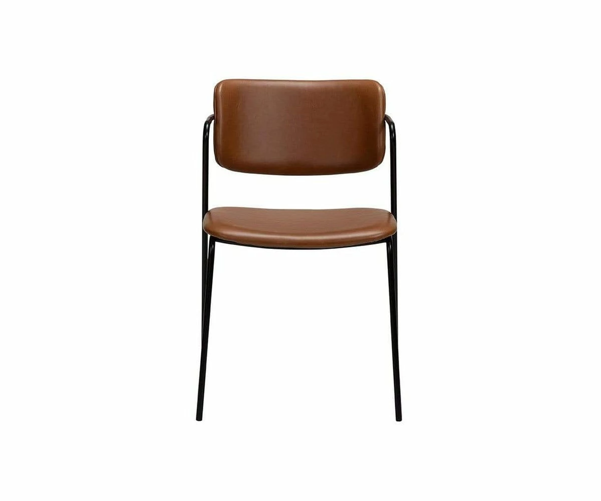 Classic dining room style begins with the modern Finn Chair. Featuring a sturdy metal frame and black, powder-coated legs, this chair is both simple and high-quality in its construction and design. Straight, untapered legs echo the clean lines of the arms, which are short but comfortable while dining or sitting in a relaxed position. These chairs are able to be stacked two high, making storing spare chairs for future guests a simple endeavor.