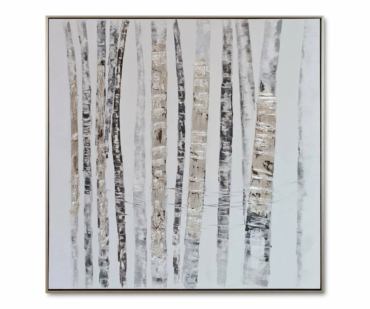 The Ionis II Painting depicts vertical tree trunks in varying widths. A foggy pale grey background infuses a hushed, wistful mood. Includes metallic touches throughout and is finished with a thin silver colored frame.