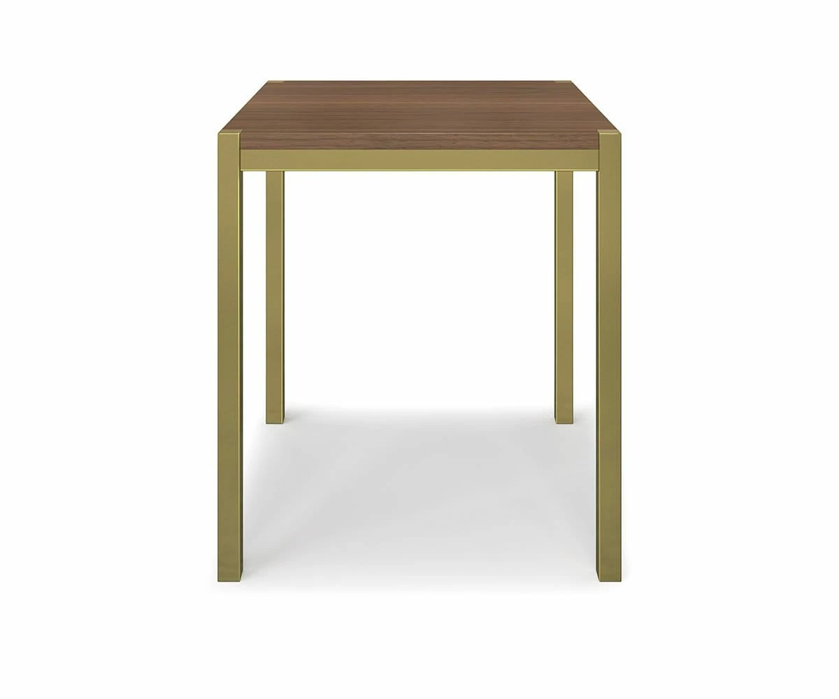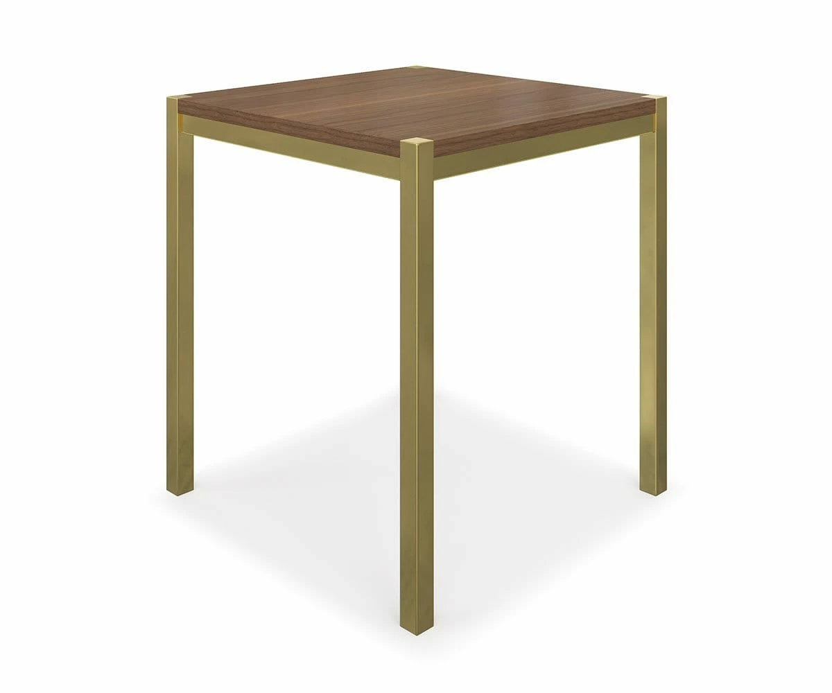 The Lennox Bar Table is a versatile piece, and can easily blend with any number of decor styles. Timeless in its classic design, this table is a wonderful addition to any space, and is built to serve for years to come. Featuring a striking combination of warm walnut tones punctuated by polished brass accents, this table showcases four sturdy metal legs and an additional bar for stability. The square, symmetrical frame of this table means that it’s ideally used as a minimalistic bar area, a place to serve hors d’oeuvres, or even as a streamlined dining table for two. The legs of this piece come up through the tabletop and lie flush with the surface, adding a touch of modern style to this contemporary table.
