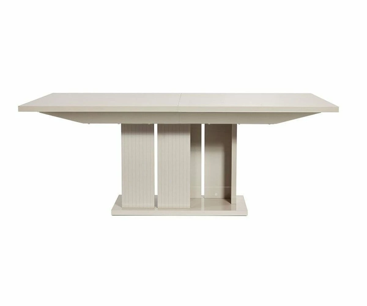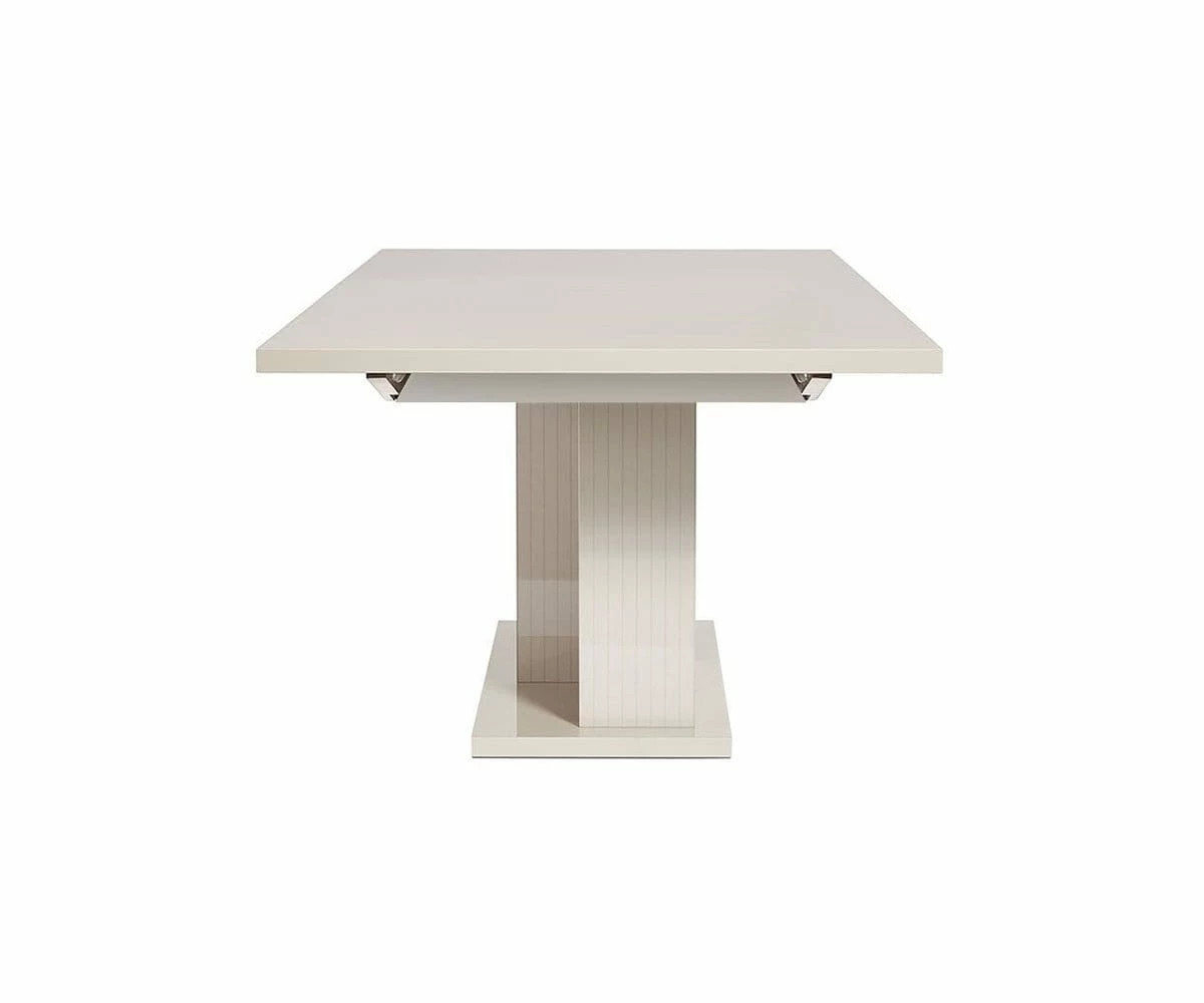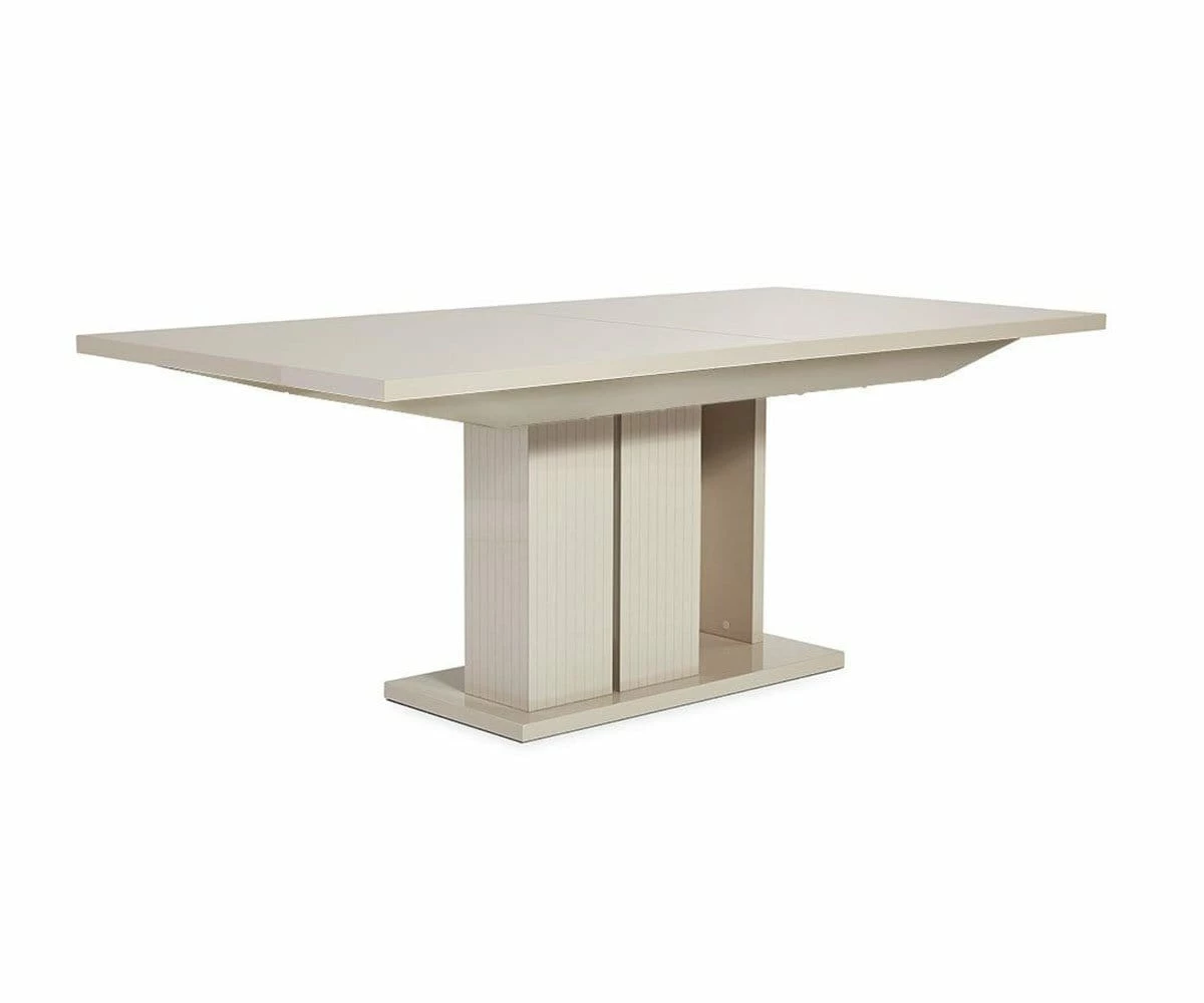 The Italian-made Niccola Extension Table is the perfect piece to luxuriously streamline your home dining experience. Pinstriped detailing adds stylish texture and an air of modern contemporary glamour to this piece, while brushed metal hardware contrasts elegantly with the high-gloss finish. A single pedestal foot allows ample room for chairs to tuck beneath this table, while hidden extension leaves are at your beck and call to elongate your dining space as needed.