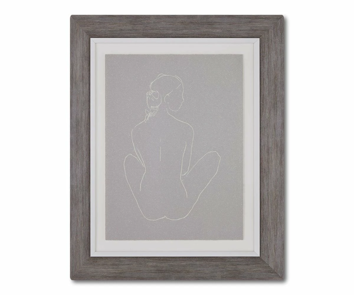 The Tranquil Composition I subtly infuses calm into your space. This minimalist line drawing of the resting woman resembles a modern masterpiece. The neutral color palette sets the tone, from the design to the torn edges of the paper and completed by the wooden frame.