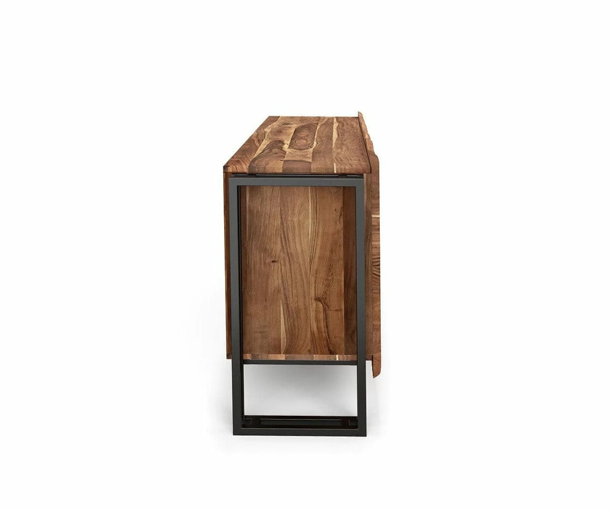 The rustic look of the Varden Sideboard is completed by a natural live edge that runs across the top of this piece, a feature which renders each piece in this collection one-of-a-kind. Solid Acacia crafted into an organic shape contrasts with the stark twin lines of the steel frame, turning this sideboard into an intriguing and contemporary accent piece. Within the three doors of this piece are stationary shelves which feature ample and welcome storage space.